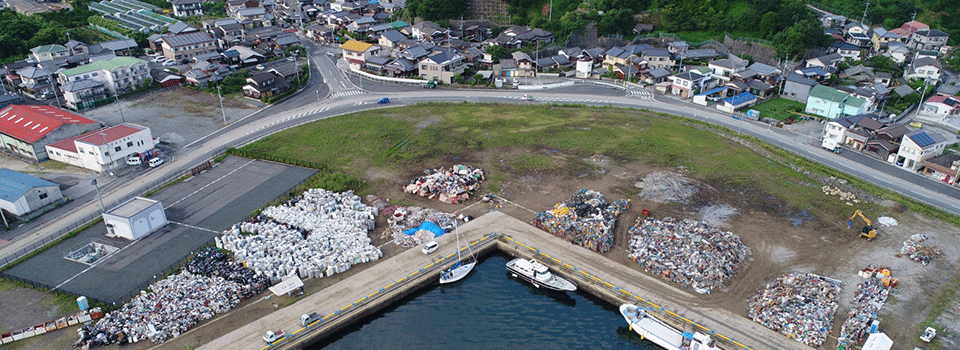 平成30年7月豪雨災害では、宇和島市において計1,767戸の住宅被害が発生。推計で約52,650tの災害廃棄物が発生するとされ、復旧に向けて迅速な処理が必要でした。本仮置き場では、2年以内に処理を終了し、資源の再利用率が90%以上となることを目標としました。